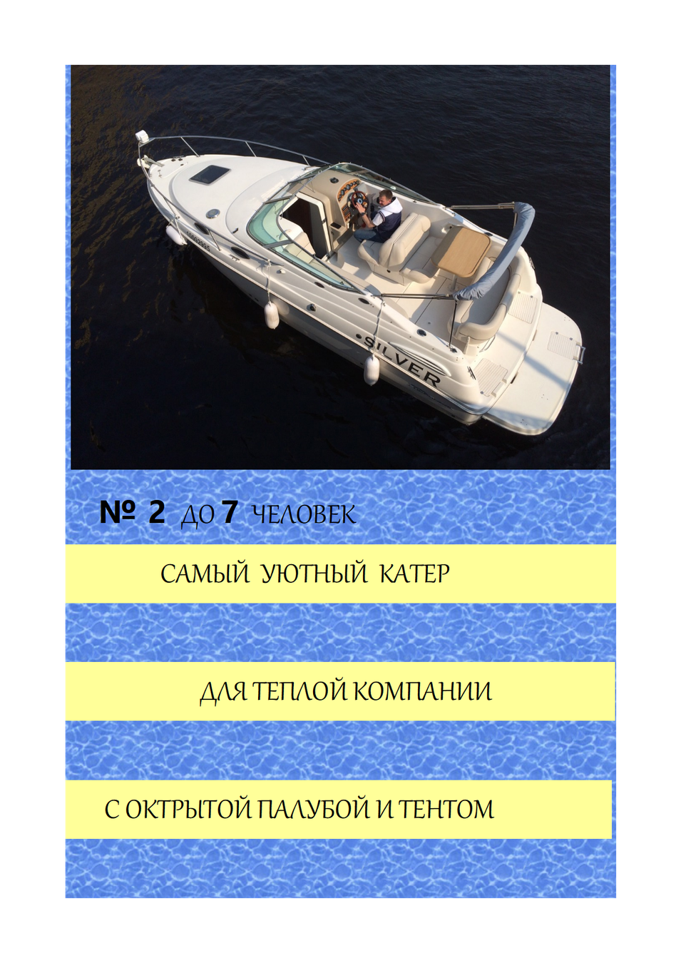 - Катер № 6 можно арендовать не менее, чем на 2 часа. Стоимость 2 часов 38 000 ₽